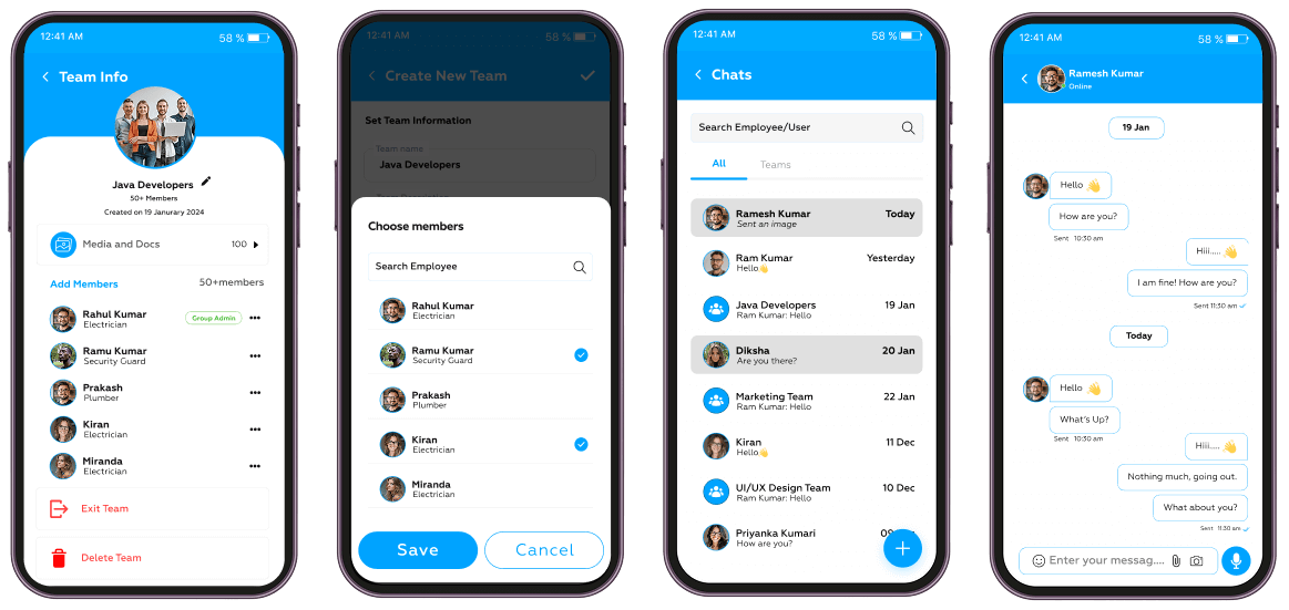 - Quick Search: Find employees or teams by name/designation with dynamic filtering.