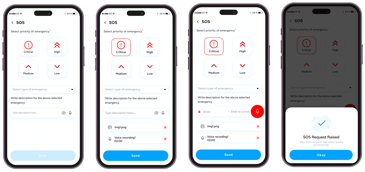 - Contextual Inputs: Add description, voice notes, and images to help responders assess the situation before arriving.