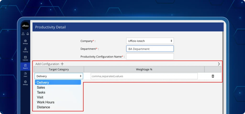 - Assign percentage weights for tasks, distance, working hours, sales, visits, unreachable duration, and other configured targets.
